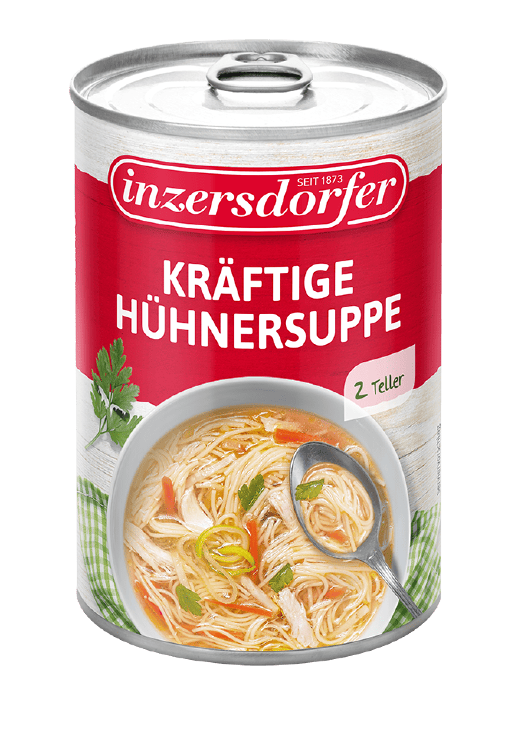 Wasser, Hühnerbrühe (Wasser, Hühnerfleischextrakt), Fadennudeln gekocht 7,8 % (Wasser, HARTWEIZENGRIESS, HÜHNEREIEIWEISSPULVER), Hühnerfleisch gegart 5 % [Hühnerfleisch, Wasser, Stärke, jodiertes Speisesalz (Speisesalz, Kaliumiodid), Maltodextrin, Dextrose, Glukosesirup], Karotten, Gelbe Rüben, SELLERIE, Lauch, Hühnerbrühe gekörnt [Speisesalz jodiert (Speisesalz, Kaliumiodid), Zucker, Stärke, Hühnerfett, Hühnerfleisch, Aroma, Zwiebeln, Maltodextrin, SELLERIE, Karotten, Petersilie, Hefeextrakt, Sojasaucenpulver (SOJABOHNEN, WEIZENMEHL, Speisesalz), Farbstoff: Beta-Carotin], Hühnerfett, Sonnenblumenöl, Aroma, Gewürze.