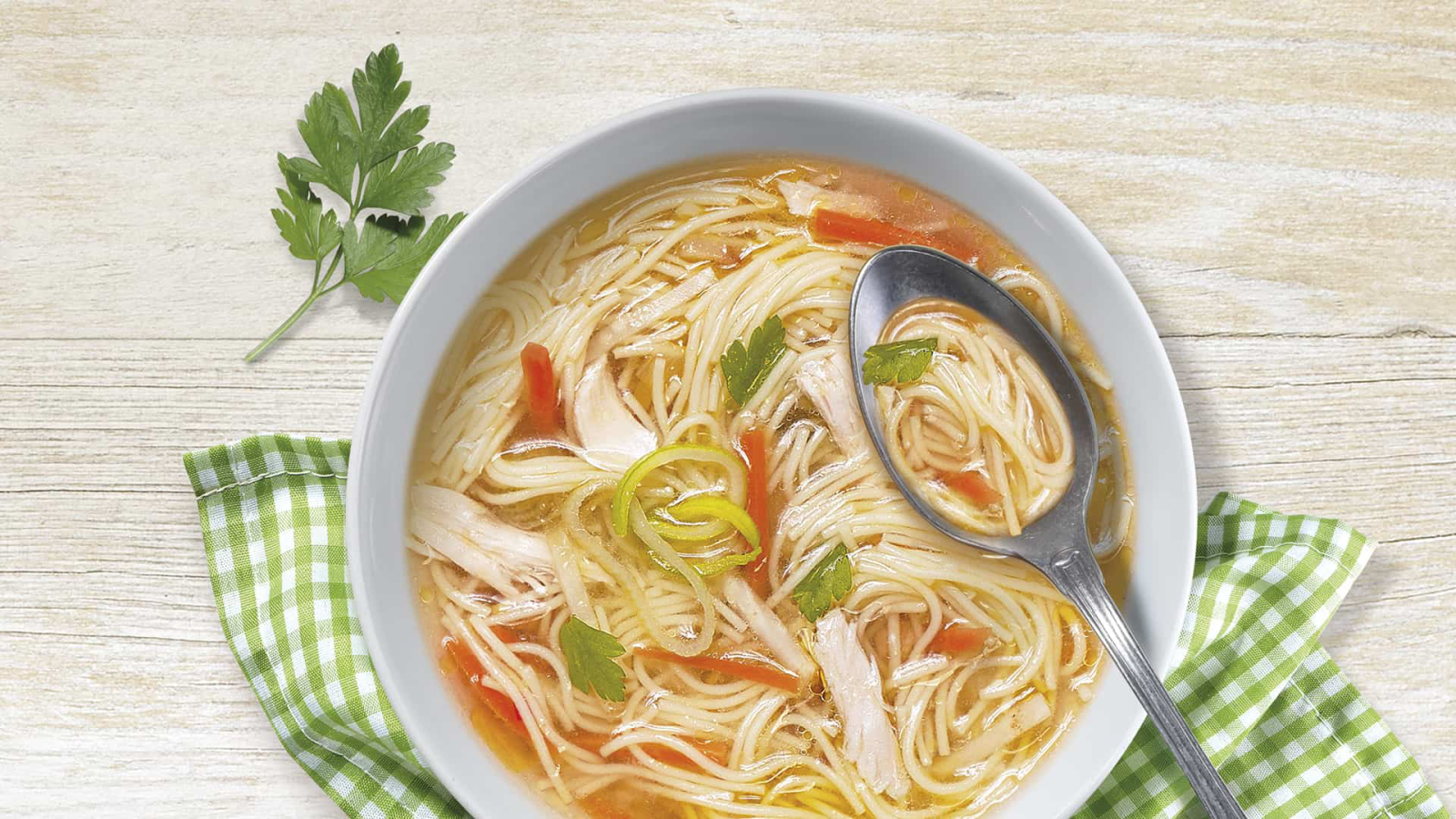 Der Duft einer klaren Hühnersuppe mit Hühnerfleisch, Fadennudeln, Karotten und Lauch weckt nicht nur im Winter frohe Gemüter. Diese Suppe ist eine ideale Stärkung für zwischendurch und eine Wohltat für den Magen.